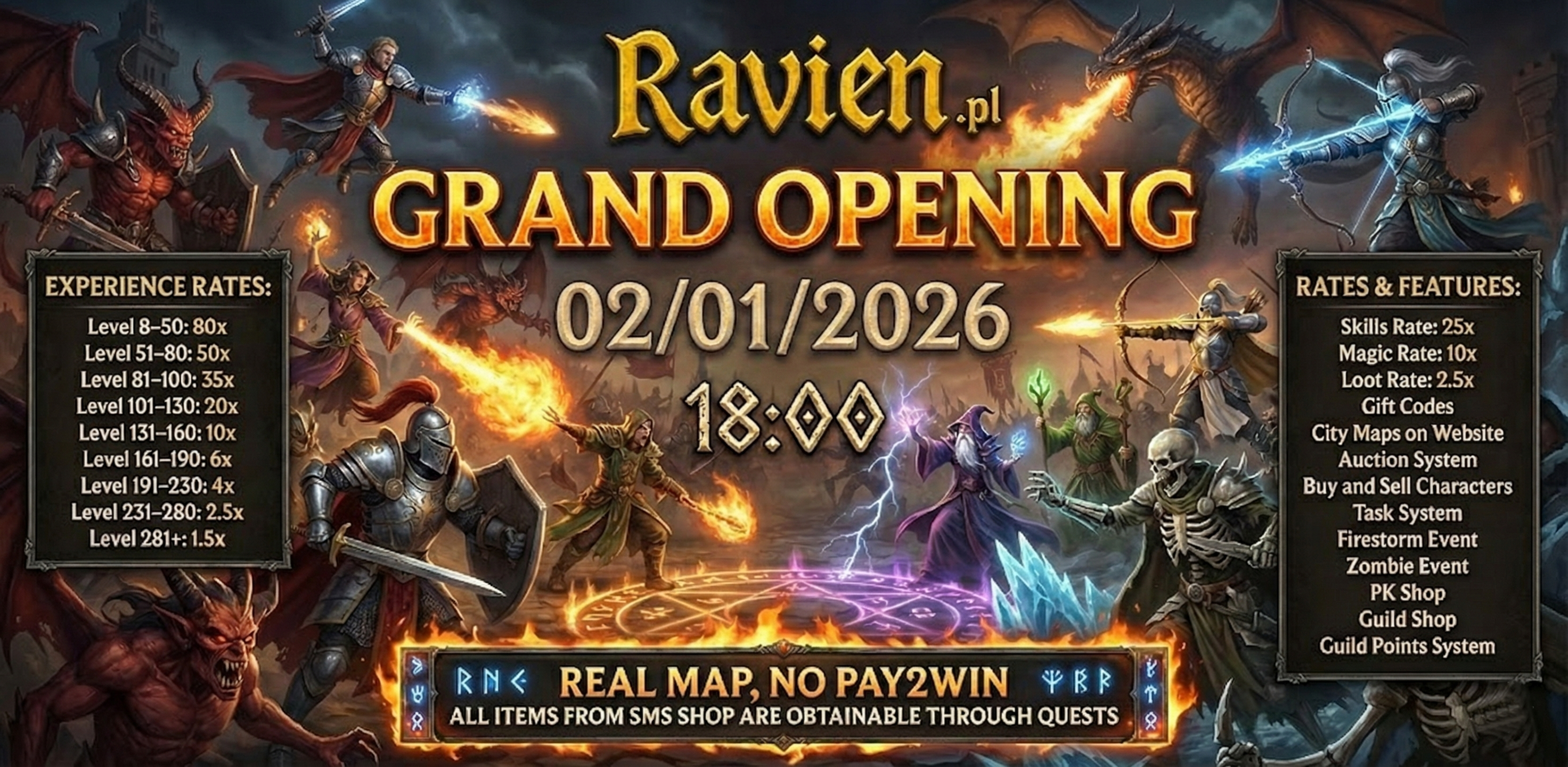 🔥 RAVIEN OTS - REAL MAP 8.60 🔥 O retorno da lenda em uma versão profissional! INÍCIO DO SERVIDOR: : 02.01.2026 (horário de Brasília) 18:00 >>>SITE OFICIAL <<< >>> DISCROD <<< 📊 INFORMAÇÕES DO SERVIDOR IP : Ravien.pl Porta: 7171 Cliente:: 8.60 (OTClient / Tibia Client) Tipo: PVP / RPG Estágios de Experiência (Long Term): 1 - 50: 80x 51 - 80: 50x 81 - 100: 35x 101 - 130: 20x 131 - 160: 10x 161 - 190: 6x 191 - 230: 4x 231 - 280: 2.5x 281+: 1.5x Skill: 25x | Magic: 10x | Loot: 2.5x ⚔️ PLAY TO WIN – RESPEITO AO JOGADOR Cansado de servidores onde tudo precisa ser comprado? Nós também. No Ravien, itens do SMS Shop podem ser obtidos através de Questy e bosses. Sem pay to win, balanceamento justo e jogabilidade honesta. 💎 SISTEMAS ÚNICOS 🎁 CÓDIGOS DE PRESENTE GIFT KODY Siga nosso Discord e Fórum. Códigos com pontos gratuitos são liberados regularmente. 🤝 COMÉRCIO DE PERSONAGENS Sistema seguro para compra e venda de personagens diretamente pelo site. 100% seguro, troca automática por pontos premium. 📜 SISTEMA DE TASKS Complete missões, derrote monstros e ganhe experiência extra e recompensas. 🗺️ MAPAS DAS CIDADES Mapa interativo no site com áreas de hunt e quests marcadas. Ideal para jogadores novos e veteranos. 💀 PVP & GUERRA 🛡️ Guild Points – pontos automáticos para guilds no início 💀 PK Shop – mate jogadores e compre itens exclusivos ⚔️ Balanceamento – ajustado especialmente para a versão 8.6 🎉 EVENTOS E ATRAÇÕES 🚀 EXP +20% (sexta a domingo) 🧟 Evento Zombie 🔥 Evento FireStorm 👹 Invasões frequentes de bosses 🏆 TOP PLAYER DA SEMANA Todo domingo, o melhor jogador do servidor (Top Level) recebe pontos premium. A competição é constante. 📸 MUNDO DO JOGO Oken, Gengia, Pyre, VIP Isle – tudo disponível. Quests imersivas e RPG completo. Não espere até que outros ocupem os melhores lugares para upar.. >> JOGUE AGORA << -