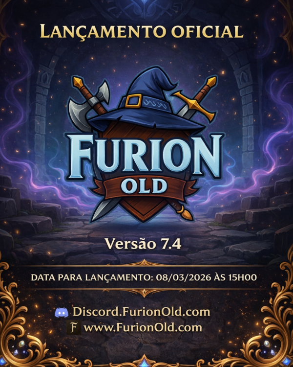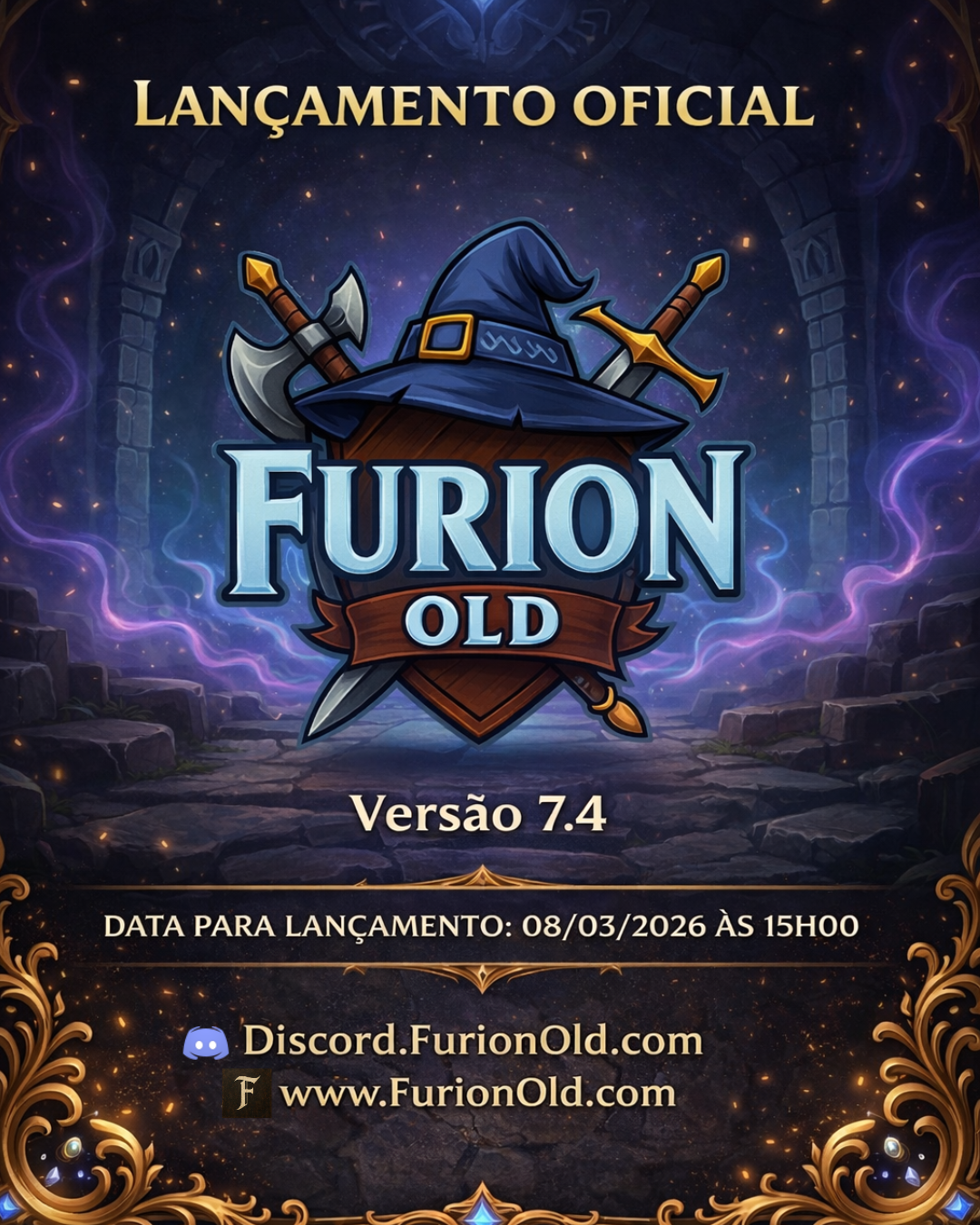 🚨 LANÇAMENTO OFICIAL FURION OLD 7.4! 🚨 Chegou a hora, aventureiros! O servidor abre oficialmente suas portas: 📆 08 de Março de 2026 🕒 15:00 (horário de Brasília) Versão 7.4 clássica, stage rates, mecânicas nostálgicas e muito mais! Se preparem, porque o Furion Old está iniciando! 🔥 Stage Rates, Global 7.4, Task System, Cam System, Live System, Daily Raids, Quests Custom, News Outfits, Auto Spell, Custom Client, Store System, Market System, Dummy System e muito mais! Links abaixo: www.furionold.com discord.furionold.com Nos vemos no dia 08/03 às 15h!